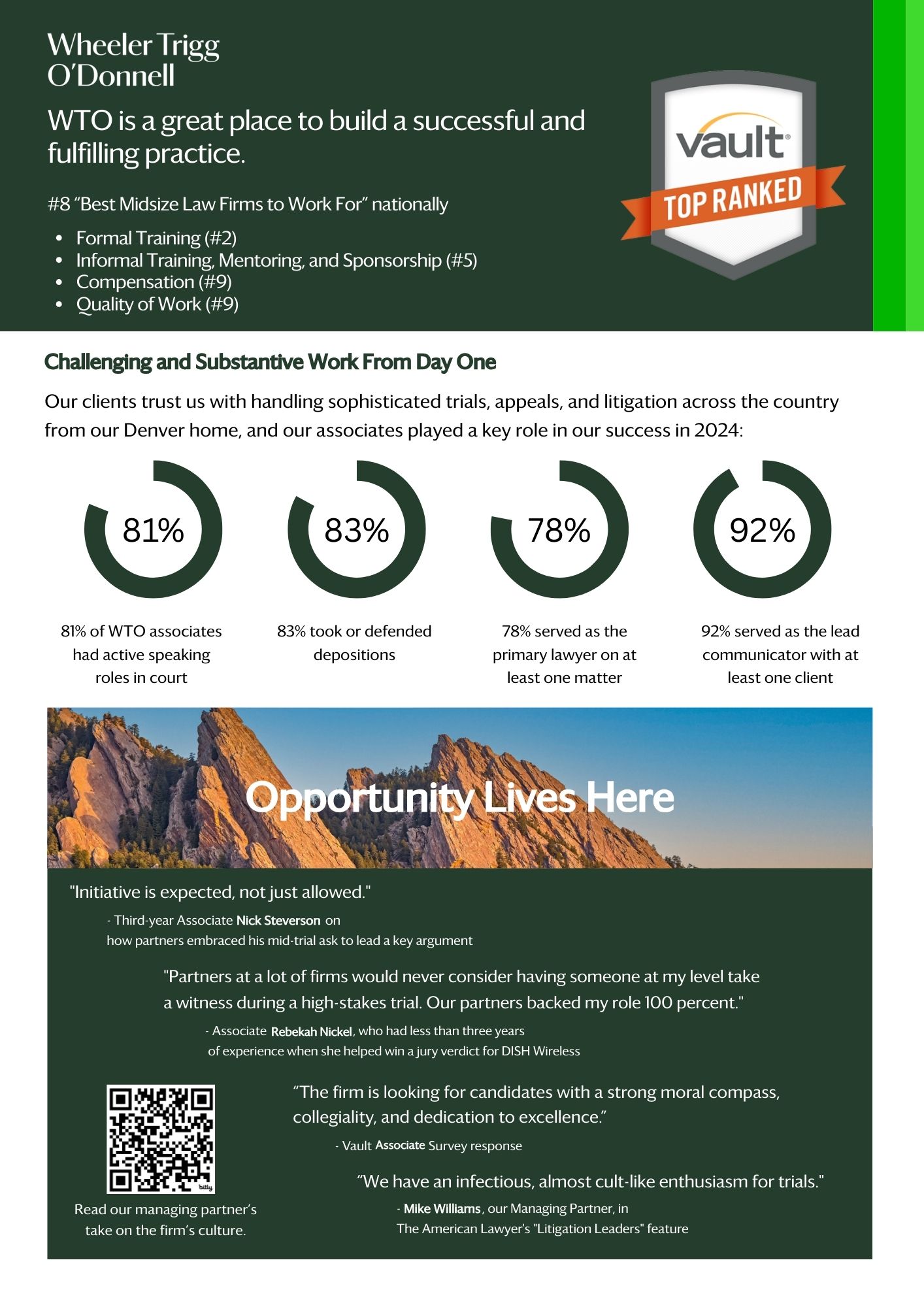 Associate satisfaction is high at WTO because we focus on providing unique opportunities to lawyers early in their careers. Based exclusively on associate surveys, Vault named WTO one of the “Best Midsize Law Firms to Work For” nationwide, and noted that associates “feel valued and enjoy being able to tackle substantive work from the start in the firm’s collegial, social environment.”